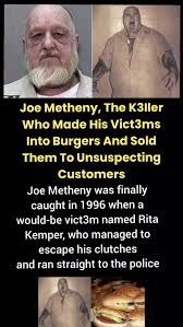 25 maart 2025 – Joe Metheny staat bekend als een van de meest gruwelijke seriemoordenaars in de Amerikaanse geschiedenis. Zijn misdaden waren niet alleen gewelddadig, maar ook onvoorstelbaar macaber: hij bekende dat hij zijn slachtoffers niet alleen vermoordde, maar hun vlees ook vermengde met hamburgers die hij aan nietsvermoedende klanten verkocht. Zijn zaak schokte de wereld en gaf een gruwelijk inzicht in het brein van een psychopaat.