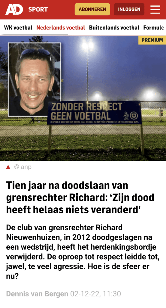 ALMERE – Op 2 december 2012 werd de Nederlandse voetbalwereld opgeschrikt door een brute aanval op de 41-jarige vrijwillige grensrechter Richard Nieuwenhuizen. Wat begon als een jeugdwedstrijd tussen SC Buitenboys en SV Nieuw Sloten eindigde in een gewelddadige mishandeling, waarbij Nieuwenhuizen meerdere malen werd geschopt en geslagen door een groep jeugdspelers en een vader. Een dag later overleed hij aan ernstig hersenletsel. De zaak leidde tot nationale verontwaardiging en zware straffen voor de daders.