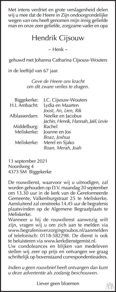 Henk Cijsouw stond bekend als een vriendelijke en gelovige man, een centrale figuur binnen zijn familie en geliefd in de gemeenschap van Biggekerke. Samen met zijn vrouw woonde hij op een boerderij waar ook hun dochter tijdelijk verbleef vanwege huwelijksproblemen met Van den D. Cijsouw was actief binnen de reformatorische gemeenschap, bekend om zijn rustige aard en zijn rol als stabiele vaderfiguur.
